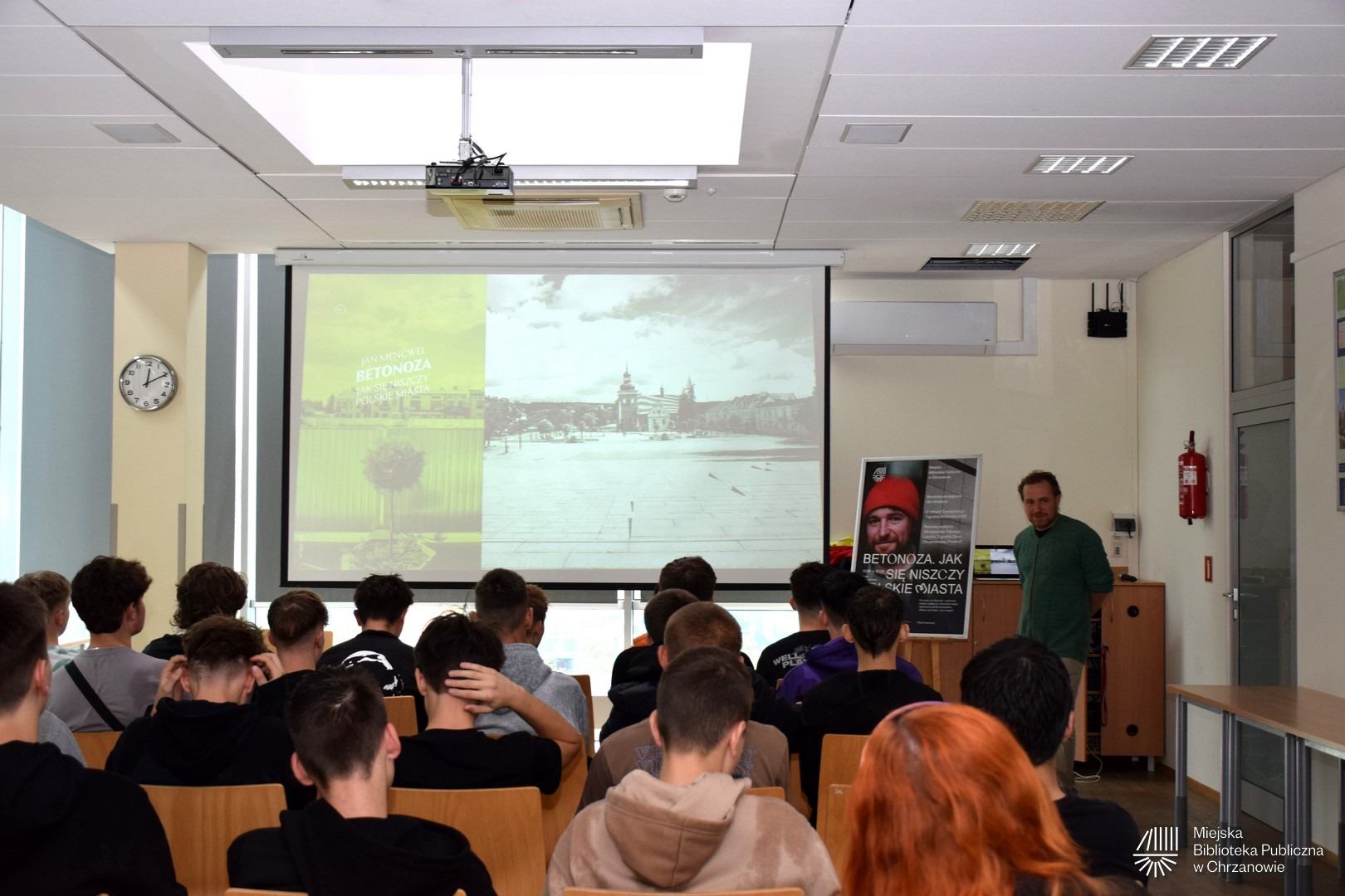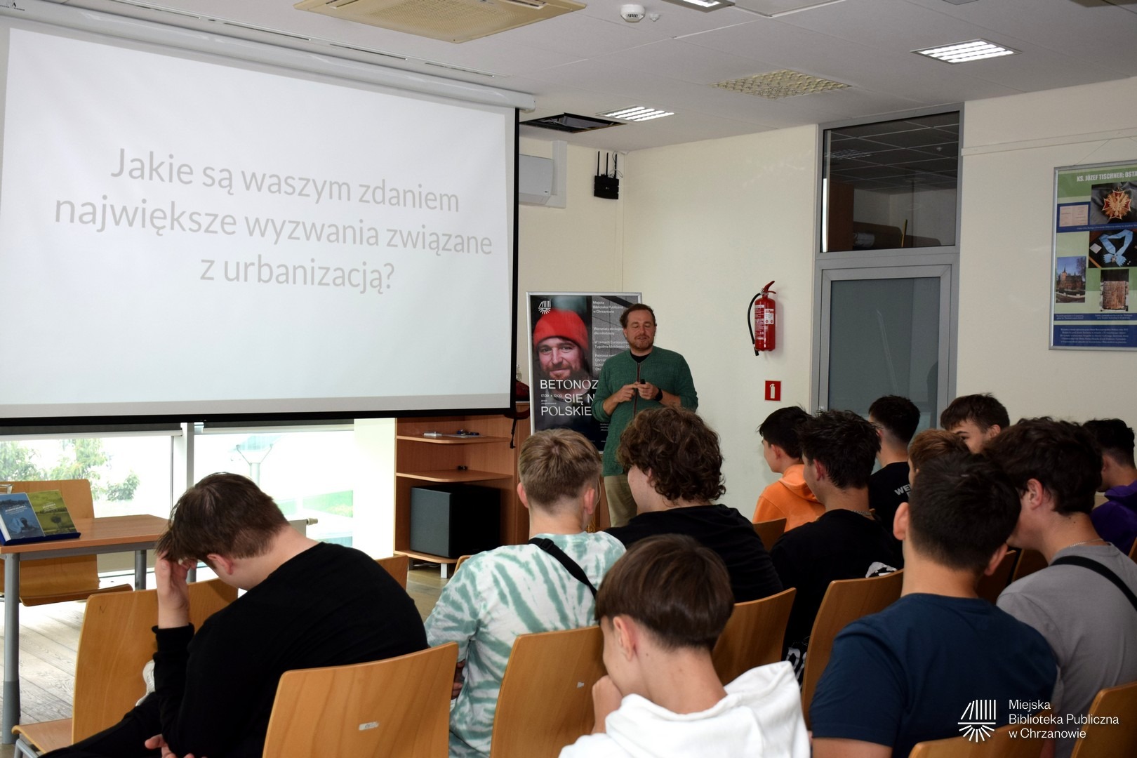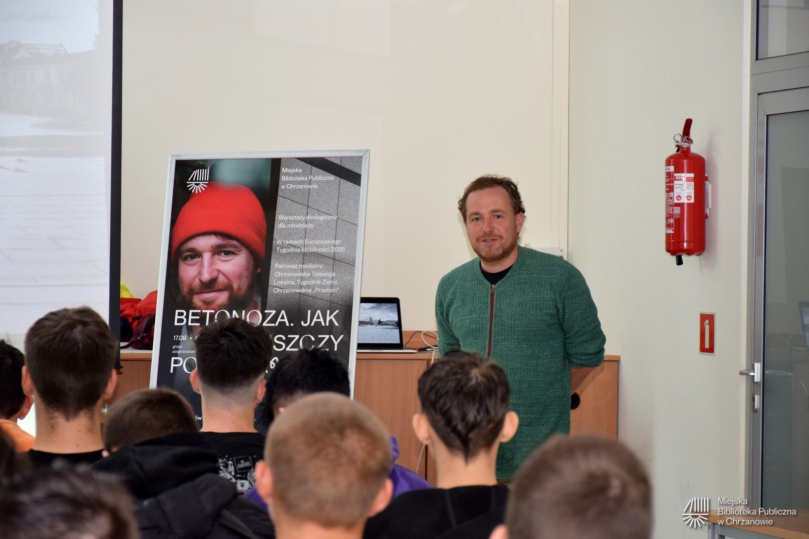 17 września 2025 uczniowie z Zespołu Szkół Technicznych Fablok przyszli do biblioteki, by spotkać się z aktywistą miejskim – Janem Mencwelem.
