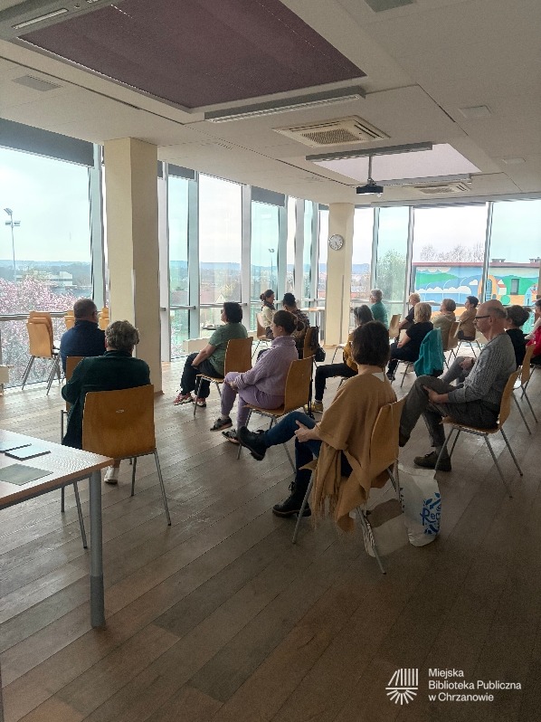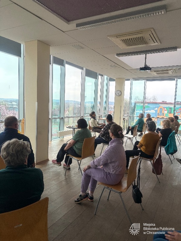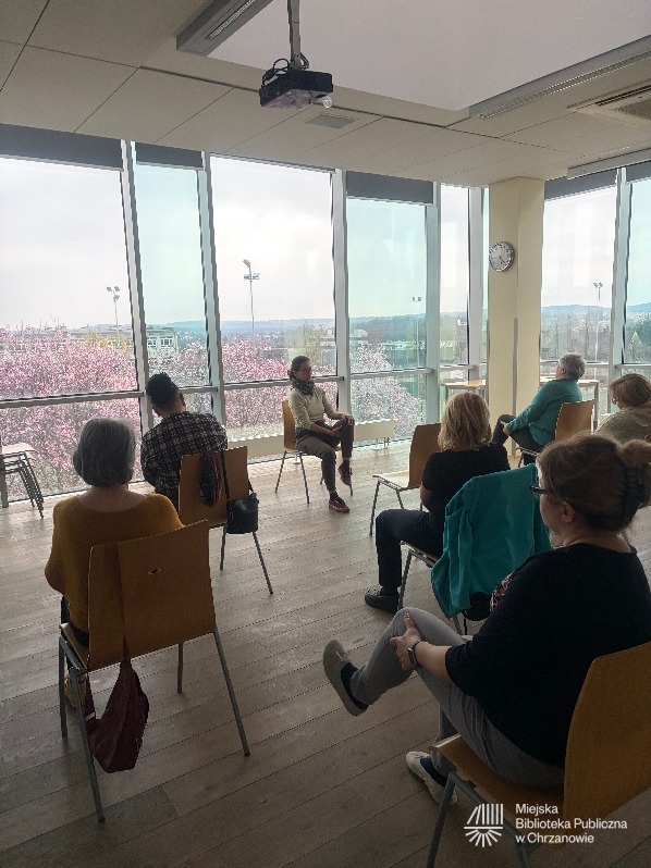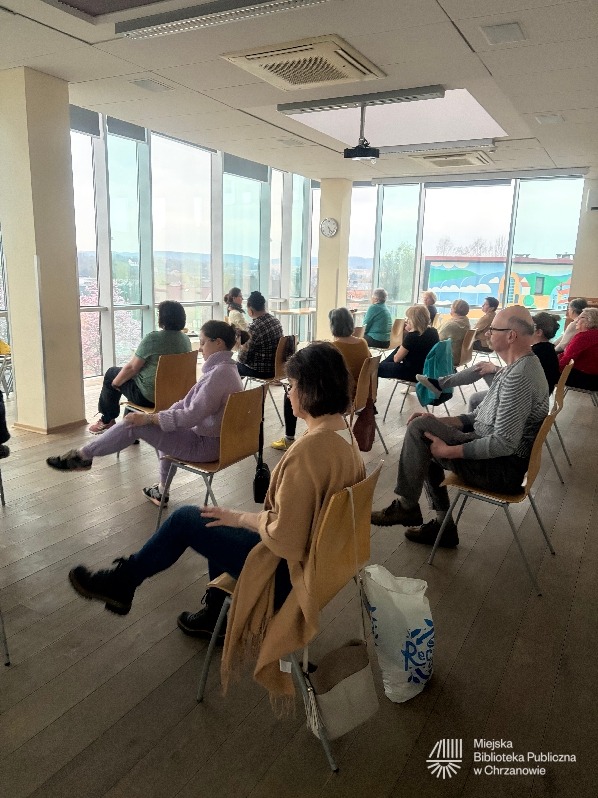 Aktualności, Relacje / 9 kwietnia 2026 / DIMpoleca, joga na krzesłach, oddech, relaks, spotkanie z jogąKwietniowe spotkanie z jogą w miejskiej bibliotece odbyło się 8.04.2026. Praktykowaliśmy z widokiem na przepięknie rozkwitające śliwy obok biblioteki, otwierając nasze ciała na wiosenny przepływ i ożywienie. Kolejne spotkanie z jogą w MBP w Chrzanowie zaplanowane jest na 13 maja 2026, godz. 16:30.